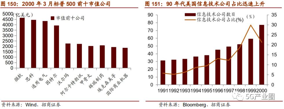美国科技股的崛起主要得益于90年代政府主导经济转型的成功。1992年克林顿政府提出:为了使美国再度繁荣,就要建设21世纪的“信息高速公路”;随后1996年美国的“96电信法案”提出网络领域向各方全面开放,各类厂商可以在任何电信领域扩张;1998年的“Internet税收特权法案”要求未来6年内禁止美国联邦政府及各州政府征收电子商业交易及Internet服务业的不合理税收;政策的支持让美国信息业快速崛起,科技股的市值膨胀也非常迅速,2000年3月标普500市值前10的公司中6家为科技公司,微软的市值更是达到4500亿美元,戴尔、雅虎等后起之秀也接近千亿美元。