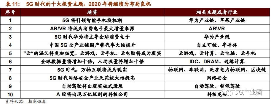 具体而言2020年我们将看到5G手机换机周期、VR/AR带来的消费电子增量、云游戏、云电脑、云手机概念将继续导入,而数据流量也将随着通信技术的革新而成数倍增加,5G时代中国的主导力量将大于过去任何一轮通信技术革命带来的新科技周期,华为将主导全球消费电子,5G全产业链的国产替代率也将大幅提升,万物互联时代也将在5G时代真正实现,而随着连接数的增加,网络安全的天花板也将会大幅提高,这些领域里面有些可能很快就可以看到业绩上的体现,为此招商证券提出2020年5G新科技周期下的十大投资主题: