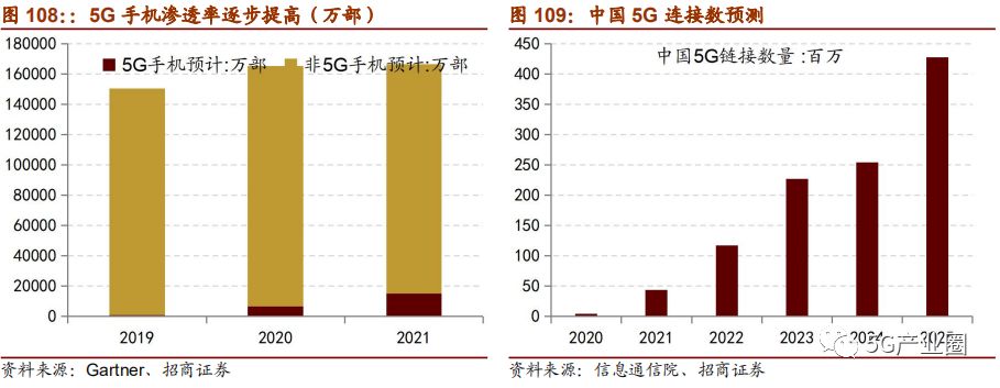 根据gartner预测,5G手机的出货量在2019年出货量约为900万部,2021年将增长到1.5亿部,复合增长率达到308%。