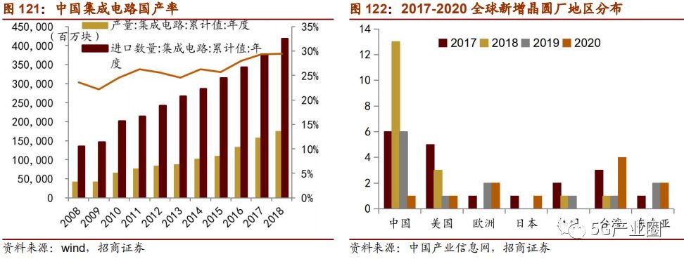 另一方面,根据SEMI预测显示,全球半导体产业正在向我国转移,同时随着全球半导体产业的转移,2017至2020年,全球将有62座晶圆厂投入运营,其中中国有26座,占比高达42%。5G建设叠加政策的扶持,半导体国产替代进程有望加速。