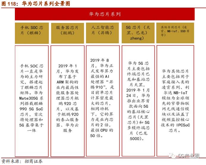 另一方面,华为的领先也得益于芯片的突破。华为芯片主要包括手机芯片的麒麟系列,服务器芯片的鲲鹏系列,AI芯片的昇腾系列,5G芯片的天罡、巴龙系列以其凌霄芯片、NB-loT芯片等其他芯片。2017年,华为发布首款手机AI芯片麒麟970芯片,2019年1月24日,华为发布了5G手机基带芯片巴龙5000,这款芯片是当时集成度最高,性能最强的5G终端基带芯片,同步支持SA和NAS组网方式,当时能与之竞争的只有高通的骁龙X55,完全处于业内领先水平。7月26日,华为首款商用5G手机Mate20X正式发布,搭载首款5G双模全网通巴龙5000芯片,成为首款商用支持SA与NSA双模的手机。此外,2019年1月华为发布了基于ARM构架的业内最高性能服务器处理器芯片鲲鹏920芯片,8月份发布的“昇腾910”芯片均处于业内最高水平。