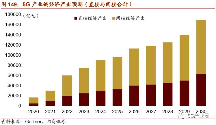 5G大科技周期预计带来万亿级别的经济产出,巨大的红利从规划设计、建设、运营到场景应用各个环节辐射到相关公司。根据中国信息通信研究院数据显示,2030年5G直接经济产出预计达到6.36万亿,相比于2020年增长11倍;间接经济产出超10万亿,相比于2020年增长超过7倍。到2030年直接与间接经济产出合计将接近17万亿元,相当于2020年的1.75万亿的十倍。5G产业发展带来的巨大经济效应,为产业链上相关个股带来巨大的增值空间。