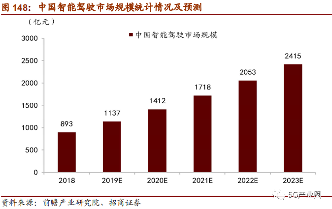 另一方面,国内消费者对于自动驾驶的接受程度、需求、支付意愿均居于全球前列。中国已经是全球最大的汽车市场,有望成为全球自动驾驶市场第一大市场。据前瞻产业研究院发布的《中国无人驾驶汽车行业发展前景预测与投资战略规划分析报告》数据显示,2015年,国内智能驾驶的渗透率为15%,其中绝大部分为低级别的自动驾驶,对应的市场规模为353亿;此后,随着汽车智能化的不断发展,预测2019年中国智能驾驶市场规模将突破千亿元,达到1137亿元。2022年将突破2000亿元,并预测在2023年增长至2415亿元左右,2019-2023年均复合增长率约为20.72%。