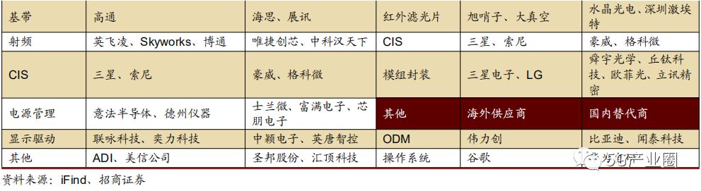 因此我们认为向智能手机提供射频器件的厂商将会从中受益,这些厂商包括天线供应商、射频滤波器供应商、功率放大器供应商、低噪声放大器供应商,射频开关供应商、基带供应商等等。