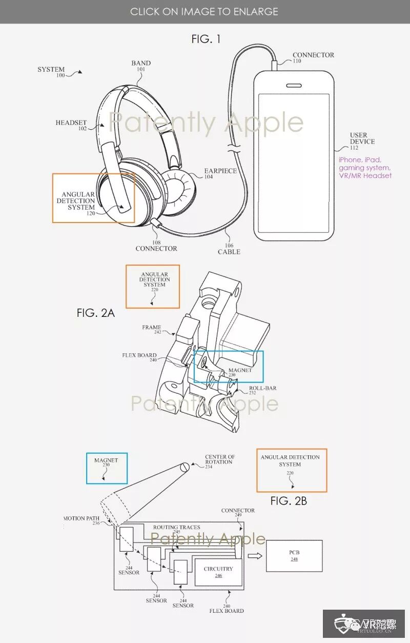 在苹果公布的专利图中,图1展示出了可以与iPhone、游戏系统、VR系统等各种设备一起使用的示例性耳机系统,图2A及图2B展示出了透视图,图2B展示出了示例性角度检测系统的框图。