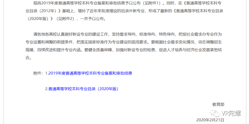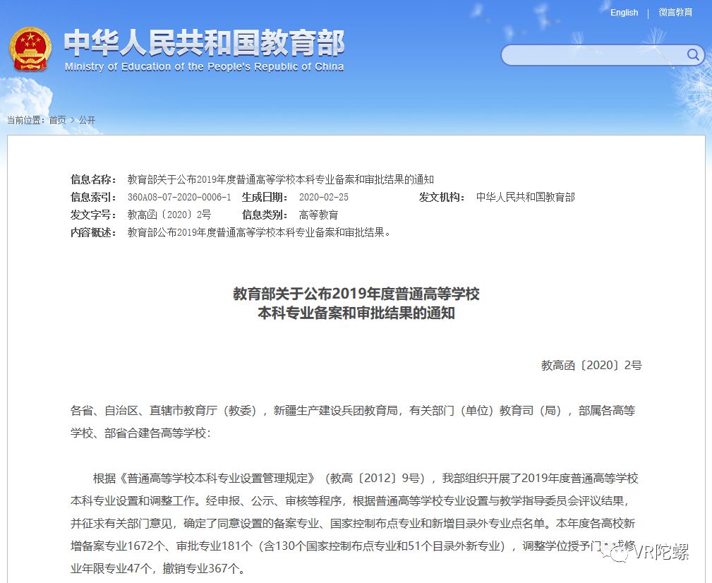 2020年3月3日,教育部印发“关于公布2019年度普通高等学校本科专业备案和审批结果的通知”,将2019年度普通高等学校本科专业备案和审批结果予以公布。