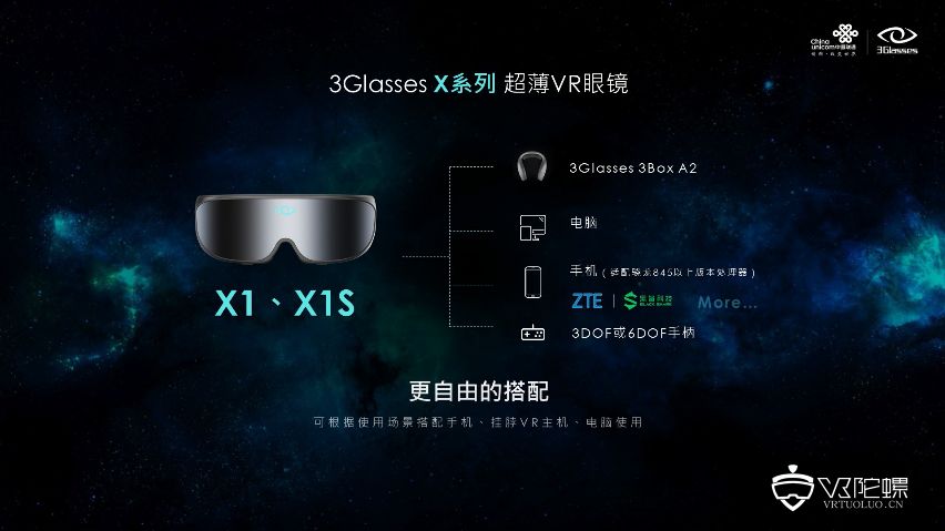 此外,3Glasses与中国联通、高通、中兴、数字王国展开的一系列合作,从硬件到内容为本次3Glasses超薄系列新品“X1S”提供强有力后盾。用户可根据使用场景自由搭配手机、挂脖VR主机、电脑、手柄进行“别致”体验。