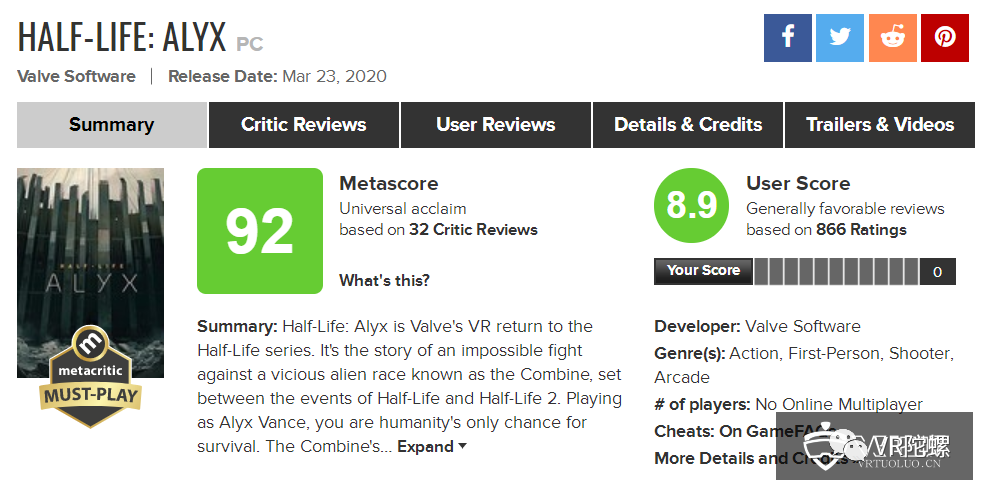 首款3A级VR游戏大作《半衰期:爱莉克斯》(《Half-Life:Alyx》)在3月24日正式发售,引发全球轰动。截止发稿时,Metacritic网站的媒体综合评分为92分,无一差评。IGN甚至给出了今年首个满分评价,大力称赞它在交互性、细节和关卡设计方面为VR游戏订立了新的标杆。它在Steam平台的玩家测评中也收获了97%的好评,作为VR独占游戏,首日的在线人数峰值就超过4万人,一举登上Steam热门游戏榜单前列,用户评价“这才是VR游戏该有的样子!”、“以前玩的真的都是VR游戏吗?”,堪称VR的“杀手级”应用。