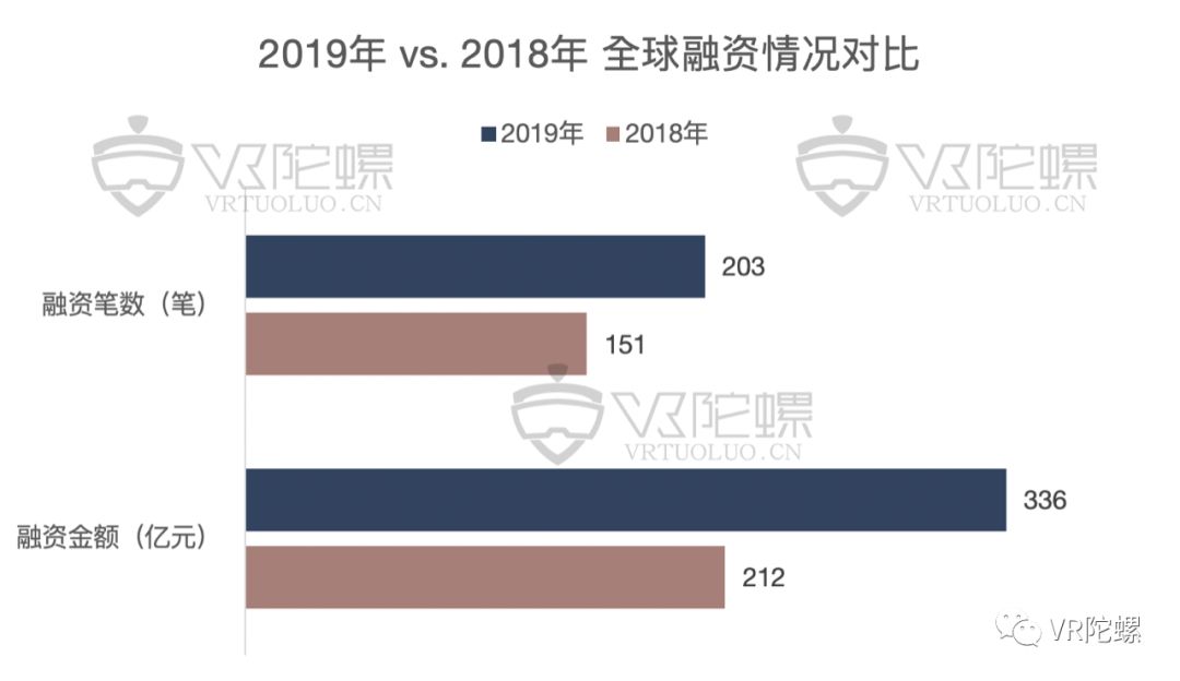 根据VR陀螺统计的2018-2019年VR/AR领域融资变化,发现2019年全球全年融资总额达到了336亿元,同比增长58%。2019年下半年融资笔数同比增长了一倍多,而且仅下半年融资金额就接近2018年全年融资额。5G带来了新一轮资本关注。经历了2015、2016年疯狂的资本追风,如今是否还会迎来新一轮泡沫?