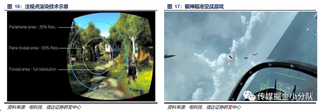 (1)计算方面-基于眼球追踪的注视点渲染技术降低计算门槛。高清的画质是VR体验的基础,目前的渲染方式对硬件要求高、功耗大。通过眼球追踪技术判断人眼注视点,就可以在画面渲染过程中仅全幅渲染注视点位置区域(局部渲染),这样既保证了看到的画面足够清晰,又大幅度降低了渲染过程中GPU负荷,从而降低VR设备对硬件的要求。