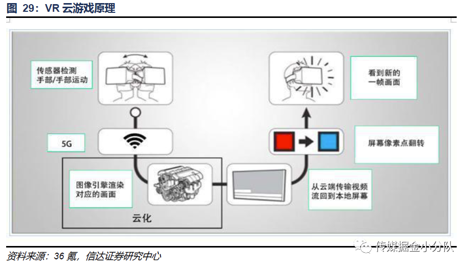 5G+云游戏技术使“小马拉大车”成为可能,降低硬件成本的同时提高用户体验。芯片部分已经分析了VR游戏渲染量相比传统游戏与传统视频渲染量大的多,而VR一体机有续航和散热两方面的考量,因此其只能采用移动端芯片,芯片性能较弱,这导致VR一体机渲染存在“小马拉大车,既要马儿吃的少,又要马儿跑的快”的问题。虽然可以通过堆叠算力来提高VR一体机渲染质量,但这将会增加VR设备的硬件成本,反而拖累VR技术的发展。而5G+云游戏技术的应用将会使弱性能处理器渲染出高质量画面成为可能。其原理在于5G可以将3D图形运算放到云端,也就是云游戏的技术路线。这样就可以利用云端强劲的PC级CPU和GPU来进行3D图形运算,再以视频流的形式传回本地的VR/AR设备上,让移动芯片的VR/AR设备也能显示出最顶级的画质。同时由于机体本身不参与渲染,可以选择性能较弱的芯片,降低成本的同时提高续航,也能减少不必要的其他散热模块,降低机体整体质量,使得VR一体机更便携。