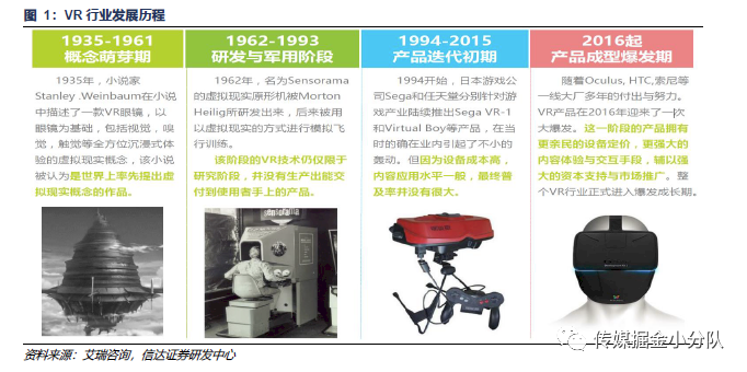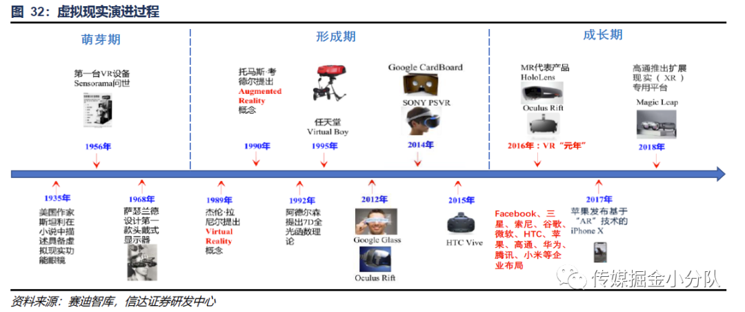 VR的概念最早源自1935年一位美国作家在小说中描述的虚拟现实功能眼镜。1956年第一台VR设备Sensorama问世,1968年萨瑟兰德设计第一款头戴式显示器。1989年,杰伦·拉尼尔正式提出虚拟现实(Virtual Reality)这个概念,随后第二年托马斯·考德尔提出增强现实(Augmented Reality)的概念。之后,1995-2015年,最老式的一批VR设备开始问世,任天堂、谷歌、Oculus、索尼、HTC先后发布了自己的VR硬件设备。2016年是VR产业发展元年,MR代表产品HoloLens和Oculus Rift问世,并且国内外大型互联网科技企业如Facebook、三星、索尼、谷歌、微软、HTC、苹果、高通、华为、腾讯、小米等纷纷布局。2017年苹果发布基于AR技术的iPhone X,2020年3月24日首款完全基于VR体验研发打造的3A游戏大作《半衰期:Alyx》正式发售,爆款游戏有望带动VR硬件设备的起飞。