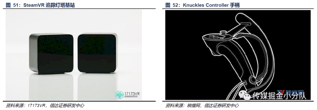 由追踪技术到Knuckles Controller手柄,Valve持续提高VR游戏体验水平。Valve早期除了开发部分VR游戏产品,其也通过研发追踪技术促进VR行业发展。早期Valve与HTC合作开发VR设备,由Valve提供SteamVR 追踪技术与软件平台支持,而SteamVR追踪技术作为早期商用的Outside-In方案拥有非常强的技术水准。该方案由Valve免费开放给市场,极大的加快了行业发展丰富了游戏内容、细节与交互体验,提升了Valve的口碑。在追踪技术取得成果后,Valve进一步研发了Valve Index PCVR设备,该设备的交互手柄Knuckles Controller由Valve设计,具备握柄部分支持电容感测,可以对五指进行追踪,此外不仅能识别压力、触感,还能识别光学数据,而且它十分敏感,能识别到快碰到握柄的手指。在玩手柄演示游戏《Aperture Hand Labs》时,玩家可通过Index手柄体验与机器人用力握手、玩石头剪刀布,效果足够逼真,游戏中的机器人不仅能计算出石头剪刀布的输赢,还能对比中指等其他手势做出回应。其他厂家的手柄还不能做到相同的体验。