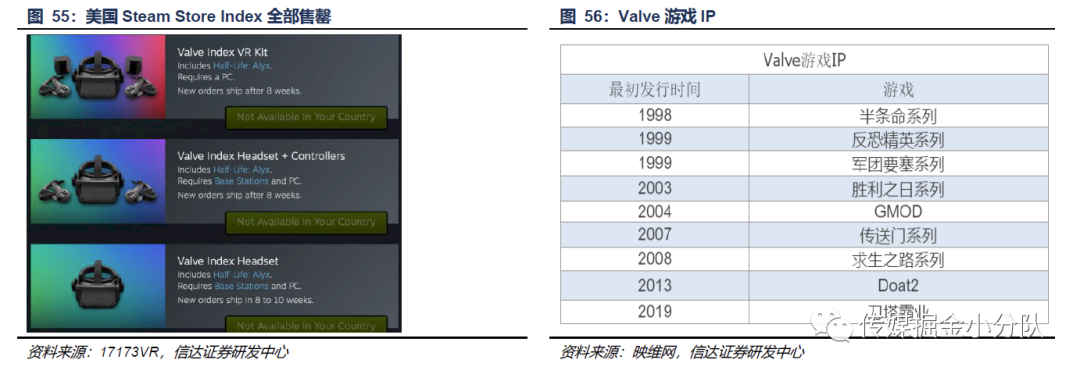 《Half-Life: Alyx》带动Valve Index销量,优质游戏IP存储为Valve内容创作稳定根基,爆款VR游戏有望推动VR设备普及。2020年3月24日,《Half-Life: Alyx》正式开售,IGN给出的10分满分的成绩体现了Valve作为老牌游戏厂商,在游戏研发方面的实力。而本身游戏特性需要Knuckles Controller以获得更好的支持,带动了硬件的销售。Valve由内容带到硬件模式初成立,在2019年末游戏公布后,Valve的Index头显相继在31个国家售罄,数据显示这款VR设备在2019年第四季度卖出了10万份,而其整年销量也只有15万份。目前Steam美国商店,该产品全部售罄。根据steam公布的2020年3月份的数据,在《Half-Life: Alyx》上线的推动下,steam上Valve Index占头显设备比重从上月的7.69%增加至11.14%,增幅最大,达3.48%。此外Rift S、HTC Vive占比较上月都有所增加。另外,3月份VR头显用户在总Steam用户中的占比为1.16%,较上月增加0.15%。