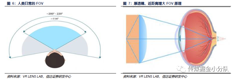 视角场(FOV)是头显设备显示效果的另一核心指标,影响用户沉浸程度。视场角在VR中代表了人眼所能看到的范围。人类视觉是由两部分视场组成的:单目 FOV以及双目 FOV。单目FOV指的是单眼的视场。正常来说,单眼视场的水平角度介于170°-175°之间。双目视场是两个单目视场的组合。组合时,可视角度通常为200°-220°。两个单目视场重叠立体部分即为双目视场,约114°,在这个视角内我们可以看到3D物体。不管在虚拟世界还是现实世界,人类对虚拟景象的获取都是通过立体双目视场来进行的,更大的视场角能够满足用户观看到更多细节,产生更加深度的沉浸感。