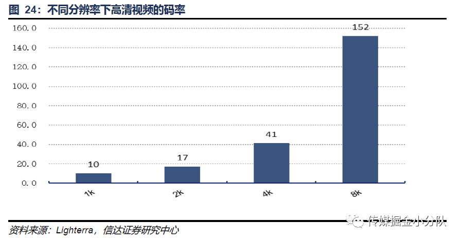 高质量VR视频内容对带宽速率要求极高。VR头显的视场角一般是110°左右,全景视频是一个360°的球体,相当于VR头显视场角的3倍多。VR头显屏幕分辨率一般为2K或4K,因此全景视频的最佳分辨率也是其3倍多,即8K或12K。只有达到这样的分辨率才能有优秀的观影体验,然而这样的分辨率对于宽带速率要求是极高的。除此以外,传统视频刷新率多为25Hz/30Hz/60Hz,VR设备为了降低时延,刷新率需要提高到90Hz,对应码率大大增高。根据Lighterra的数据常用H.264编码格式,1k分辨率,25FPS下,视频整体码率约为2.64Mbps,对应90Hz下1k视频码率约为10Mbps。进而可以计算出H.264编码格式,90Hz下,8k的码率需达到152Mbps。