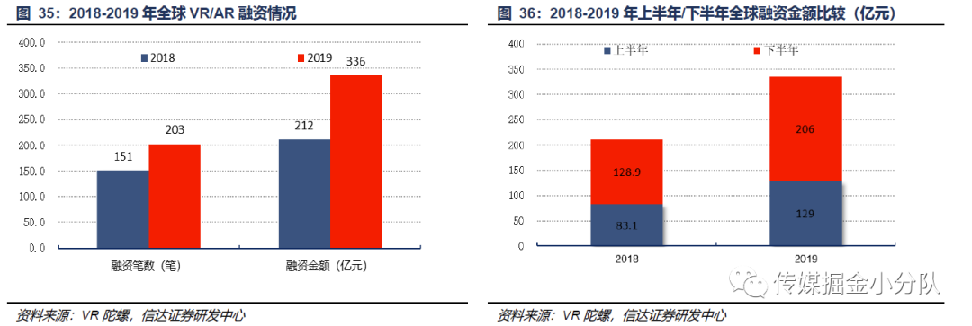 国内来看,2019年VR/AR融资总金额达到49亿元,较2018年增长近一倍,融资笔数为54笔,仅比2018年多4笔。投资笔数基本持平的情况下,投资金额增长近一倍,说明2019年VR/AR的投资活动更加集中深入。2019年下半年融资额相较上半年基本持平,为25亿元,但相比2018年下半年4.3亿元的融资额有较大幅度的增长。
