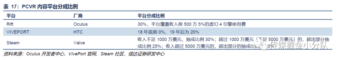 小平台在分成策略上给予更大优惠,以促进游戏内容生产者创作。目前主机游戏行业的常规分成策略是三七分,即开发者获得七成销售额,平台切走三成。Steam平台采取的是累进制,收入不足1000万美元抽成比例为30%,超过1000万不足5000万的部分为25%,超过5000万的部分为20%,而1000万美金的销售额对与目前小厂居多的VR游戏生态是一个难以逾越的鸿沟。Oculus方面,其分成比例为30%,但销售额前500万美金的虚幻4引擎使用费用由Oculus承担,该比例为5%,综合以后前500万美金Oculus分成比例为25%。而VivePort分成比例更低仅为20%。小平台分成优惠更大。