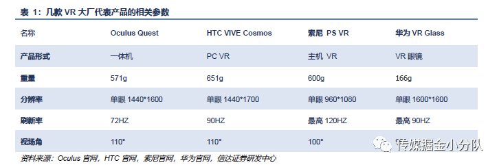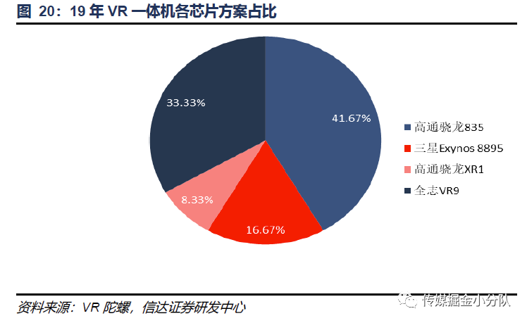 19年VR发布或上市的一体机旗舰级产品主要采用高通骁龙835芯片方案,技术水平落后同期手机芯片。根据VR陀螺的数据,我们统计了19年发布的VR一体机产品的价格区间与芯片方案。可以发现,旗舰级VR产品(价格2000元左右)采用的芯片方案主要为高通骁龙835,占总VR一体机产品发布量比例为41.7%,头部企业HTC与Oculus发布的一体机产品均采用的是该芯片。国产低端产品(1000元左右)主要采用全志VR9国产芯片方案。有部分旗舰产品采用的是三星Exynos芯片。2019年5月21日Oculus Quest VR一体机设备发售,其采用的是高通骁龙835芯片,同期上市的小米9手机采用的是高通骁龙855方案,Oculus Quest落后两代。