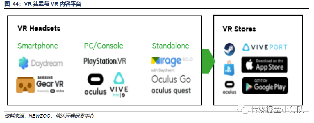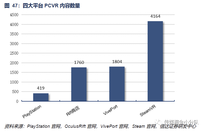 游戏平台布局上,用户与内容数量保障SteamVR在PC端的优势地位。截至2020年3月27日根据四大平台官网的数据,Steam中VR游戏与软件数量达到4164个远超VIVEPORT与Oculus RIft商店中 PCVR的内容,数量最少的是索尼PSVR仅有419个。Steam本身多硬件覆盖带来的用户量刺激了VR开发者的开发动力,使得VR内容数量大幅超过其他竞品平台。VR内容增长又进一步带动了硬件厂商适配SteamVR,SteamVR用户量增长。整个过程形成了良性循环,保障了SteamVR在PC端的优势地位。