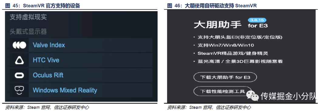 移动VR内容平台布局上Quest与VivePort受SteamVR串流影响。除了PCVR以外Oculus、HTC与绝大多数中国厂商都在进一步开发VR一体机,VR一体机采用的系统底层都是安卓系统,基于PCVR开发的游戏内容无法在一体机上运行。在PC端受阻的情况下,移动内容平台布局成为Oculus、HTC的重点。但受限于一体机本身孱弱的性能,其游戏体验差强人意。而通过SteamVR串流,用户可以使用一体机在家庭5GWI-FI网络下体验电脑端的VR应用,获取更好的游戏体验,这一定程度上会影响Oculus与HTC在移动平台上的布局。如一体机生产商PICO,虽然内置了VivePort商店,但也推出软件Pico游戏串流助手,帮助用户串流SteamVR,游玩相关游戏。一体机VR设备的加入,进一步增加了SteamVR用户量。