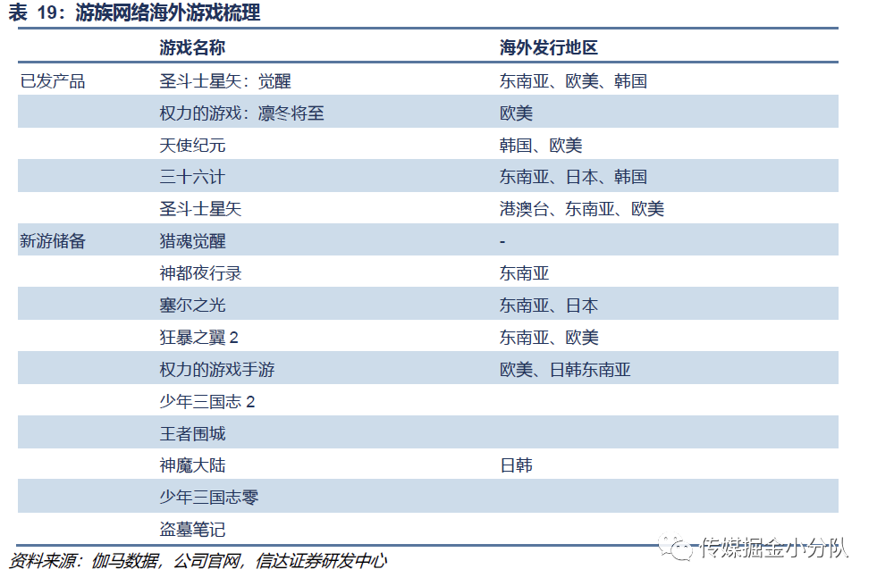 海外发行持续发力,获得多家大IP代理权。2018年公司加速全球化和区域化布局,新建新加坡研发中心,并在印度、土耳其、韩国、泰国均设立了分公司。截止到2019年上半年,公司的发行网络已覆盖了全球超过200多个国家和地区,在全球已经成立了9个地区发行和运营中心海外用户覆盖超过8亿,占到公司全部用户三分之二以上,海外市场贡献公司收入占比达58.4%。2019年上半年公司在港澳台、东南亚市场发布了由腾讯研发、车田正美工作室正版授权的策略卡牌手游《圣斗士星矢》,很快就登顶相关市场畅销榜,还发布了游族自研手游《天使纪元》等。在欧美,2019年3月,游族获得授权研发、发行的页游《Game of Thrones Winter is Coming》(《权力的游戏:凛冬将至》)英文版启动公测,上线后四次获得Facebook全球推荐,目前已上线英德法葡等14种语言;经典产品《天使纪元》在欧美地区上线以来累计注册用户超过千万。2020年上半年公司计划上线海外的2款重磅产品为《少年三国志2》和《权力的游戏》手游版。未来储备新品这一块,游族比较擅长的MMO类如王者围城有望接档狂暴之翼、天使纪元等3DMMO类的产品。日本、韩国已经上线的完美世界开发的《神魔大陆》、日本及东南亚代理的《塞尔之光》等等代理新品将继续发力。另外自研这块,少三零、盗墓笔记国内上线之后会在2020H2上线海外。