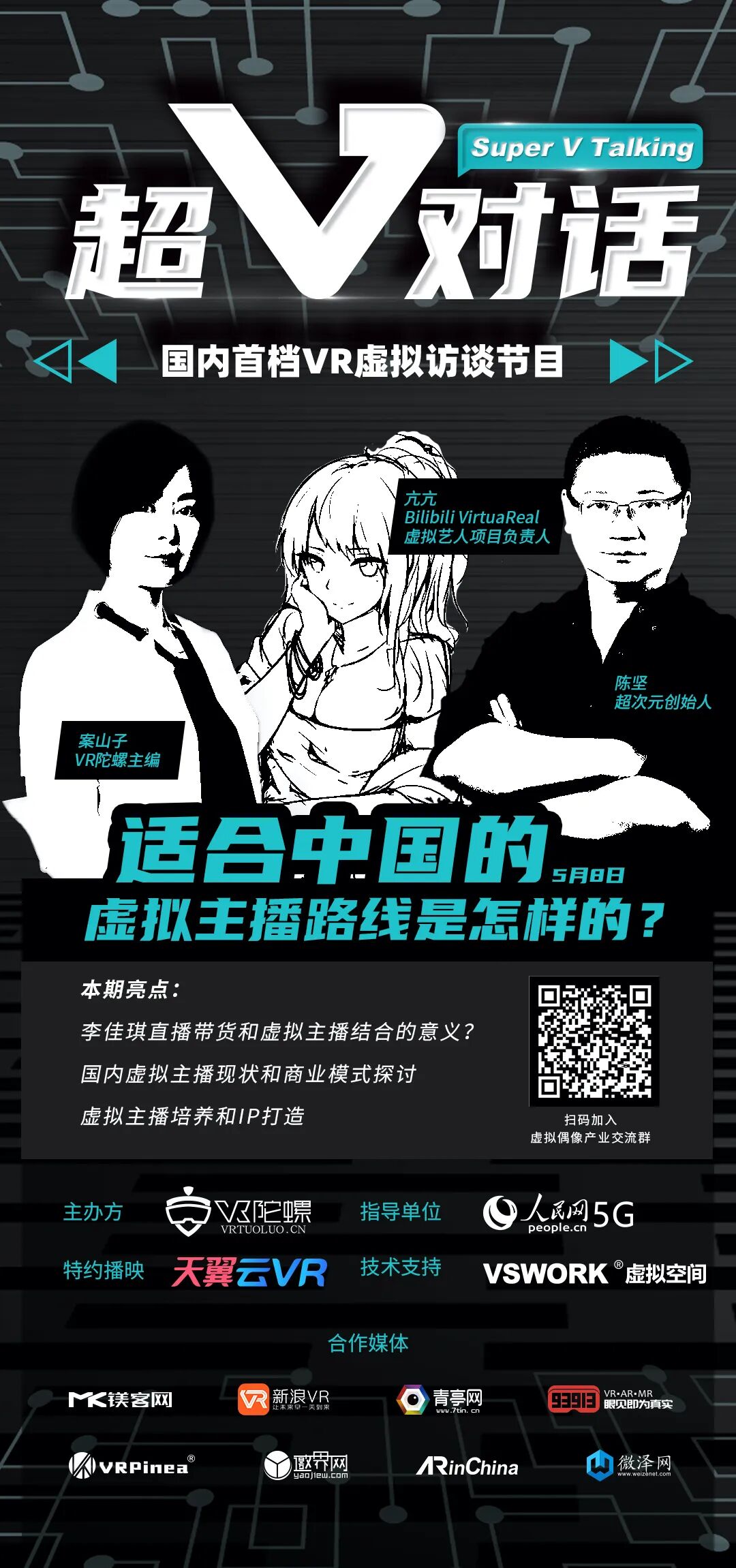 5月8日播出的《超V对话》第二期,VR陀螺将与国内最大虚拟主播平台bilibili的VirtuaRreal虚拟艺人项目负责人亢亢,以及国内最早从事虚拟偶像行业的广州超次元创始人陈坚,一同探讨“适合中国的虚拟主播路线”(长按图片扫码加入虚拟偶像产业交流群)。