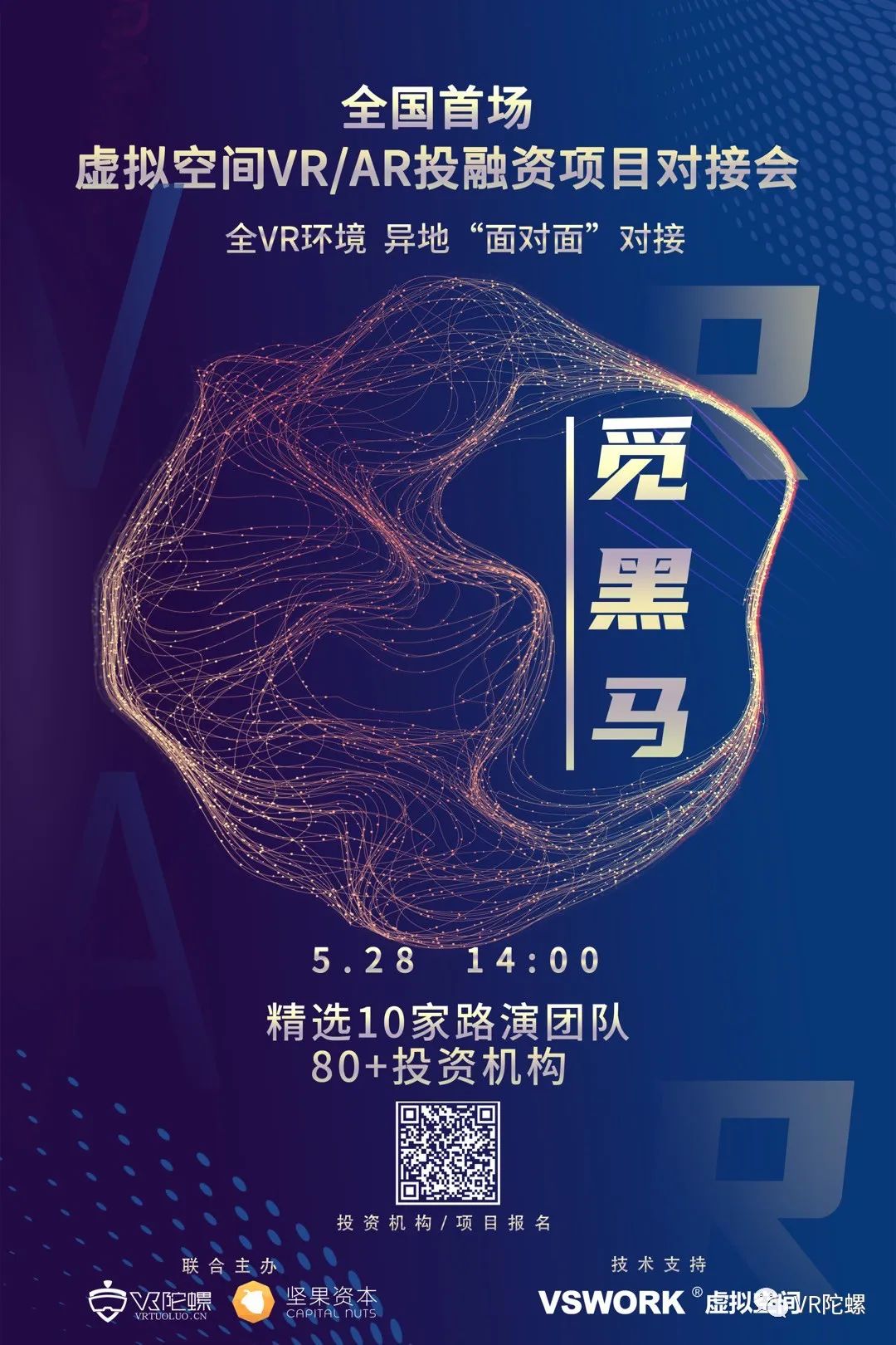 VR陀螺和坚果资本联合发起觅黑马·虚拟空间VR/AR投融资对接会,活动使用VSWORK虚拟空间在VR中进行,80+投资机构,10个精选团队,扫描图片二维码报名: