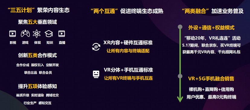 同时,此次会上中国移动还推出了移动云VR“内容生态三五计划”。即聚焦VR直播、VR知识、VR游戏、VR体育、VR影视五大垂直内容领域;拓展合作分成、版权引入,定制开发、联合出品、联合会员五类合作模式;提升VR画质升级、VR实时渲染、VR感知交互、VR跨域社交、VR行业生产五项体验感知。
