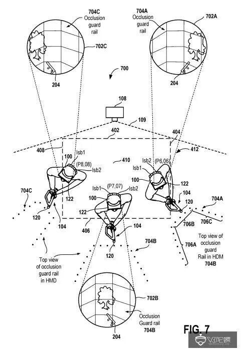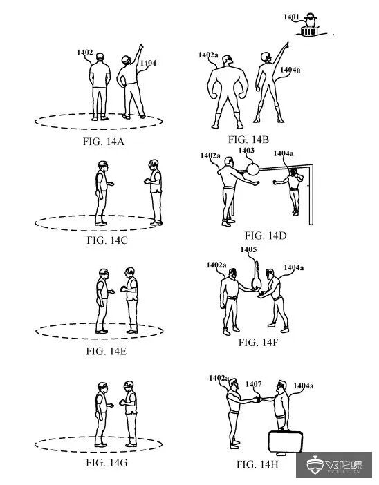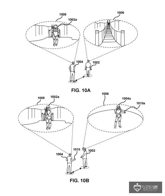 下一项专利也与运动追踪有关,但是它扩展并包括了在多个用户之间正确显示相同VR场景的功能。在提供的示例中,我们看到两个VR用户站在不同的位置,并且他们的视点显示了每个玩家在VR应用程序中的相应位置。您可能还会在以下图像中认出这些示例角色,因为它们是《星球大战》系列里的暴风兵。