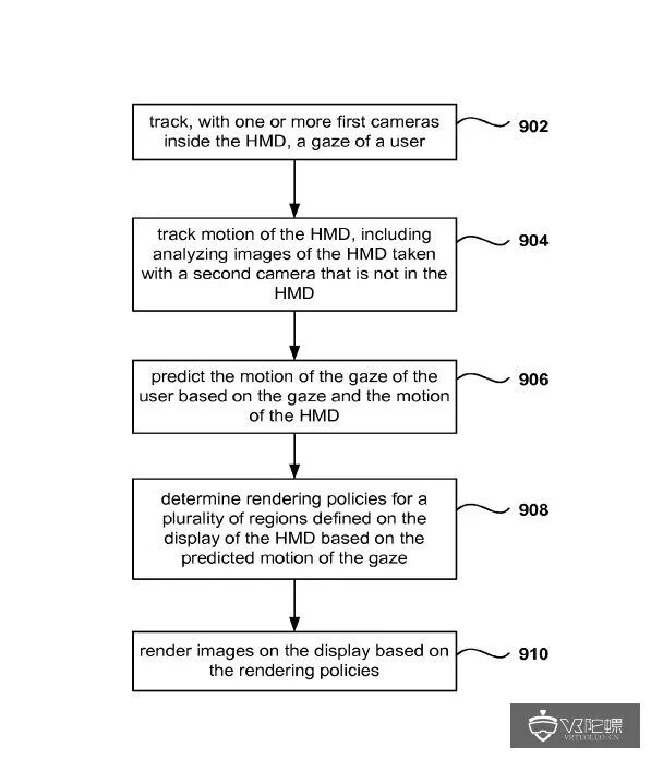 (第二专利)提出了用于在头戴式显示设备(HMD)上渲染图像的方法、系统和计算机程序。一种方法包括用于使用HMD内部的一个或多个第一照相机来跟踪用户的注视点以及用于跟踪HMD的运动操作。通过分析HMD中的第二个摄像机拍摄的HMD图像来追踪运动。此外,该方法包括用于基于注视和HMD的运动来预测用户注视的运动的操作。基于注视的预测运动来确定在由HMD渲染的视图上定义的多个区域的渲染策略,并根据渲染策略在视图上渲染图像。