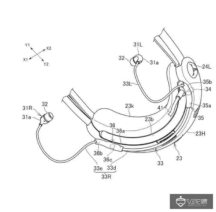 专利提出了一种能够增强头显便利性的设计。头戴式显示设备(1)包括:装置主体(10),其内装有显示装置(11);以及显示器。从装置主体(10)向后方延伸的头带(20),用于固定在使用者的头部。右耳机保持部(24R),其设置在头带(20)的右部,并且右耳机(31R)可以从其安装和拆卸;左耳机保持部(24L)设置在头带(20)的左部,并且左耳机(31L)可从其安装和拆卸。根据HMD 1,用户无需视觉确认就可以识别耳机(31R)和(31L)的位置。
