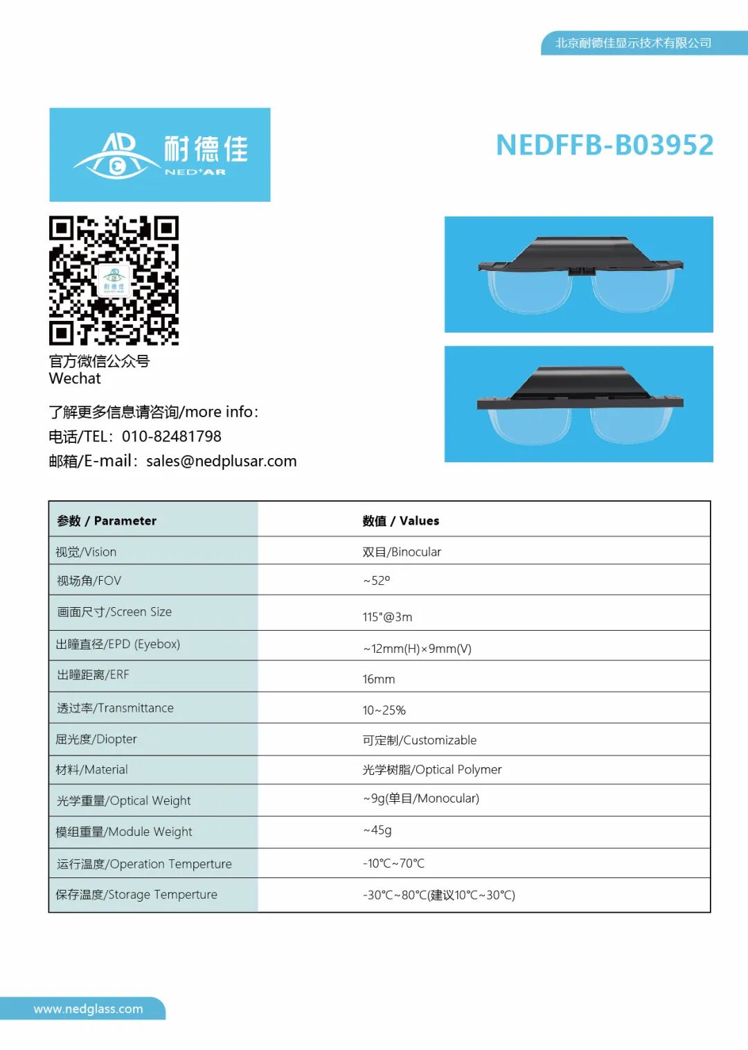 AR光学技术自诞生以来,无数科研人员一直致力于追求两个方向的极致,一是“超轻薄”,一是“大视场角”。耐德佳将自由曲面与Birdbath完美融合,推出了两款AR光学方案,在同样基于0.39"微显示屏的前提下,探索AR光学“两极”,并可提供定制化整体解决方案。