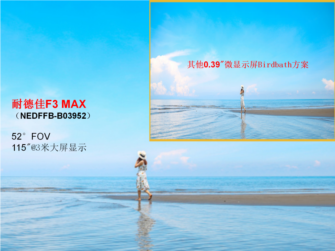 当前的Birdbath AR光学方案,如果想达到50°左右的视场角,一般需要搭配0.7"左右的微显示屏,导致成本较高,价格门槛过高,很难达到一般消费者的心理采购预期。针对这一市场痛点,耐德佳的F3 MAX采用0.39’’微显示屏,既实现了较大的视场角,又可以有效降低微显示屏成本,并可实现微显示屏的多元化,具有超高性价比。
