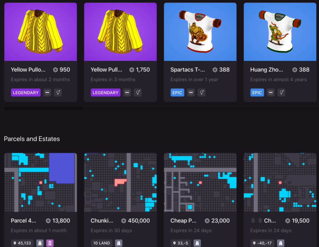 Decentraladn诞生于一个分布世界各地的30人开发团体手中。在Decentraland的世界里,共有90000块土地,每块10x10平方米,坐标由(-150,-150)到(150,150),共计9平方公里。玩家可以用代币MANA进行购买或者拍卖。其中三分之一的土地分配给了整体规划开发的社区,剩余的则供投资者购买拍卖。Decentraland在2017年和2018年进行了两次土地拍卖,玩家合计花费超3660万美元购买土地。在二级市场中更是约有1650万美元的交易额。