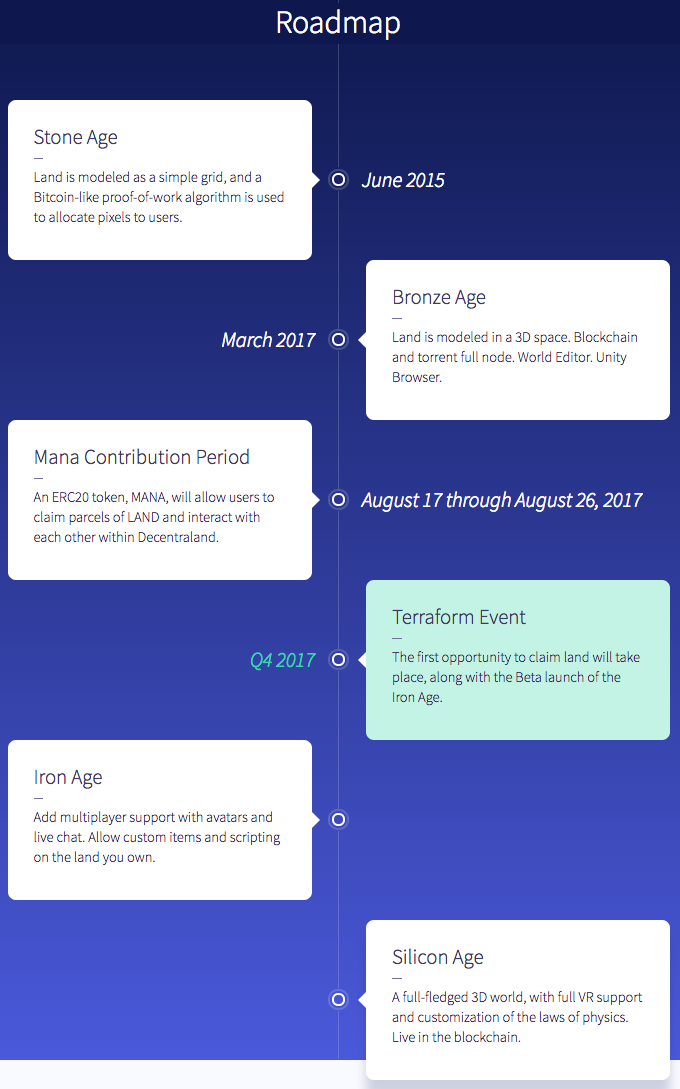在Decentraland最初的白皮书中,这个游戏平台的发展将要经过三个时代才能达到最终的硅时代(Silicon Age),这分别是石器时代、青铜时代、铁器时代。目前Decentraland正处于铁器时代,这意味着Decentraland能够支持多玩家模式、视频对话和在自己土地创建特制物品。而铁器时代之后便是硅时代,硅时代的Decentraland会实现一个完全3D的世界并且实现VR化。