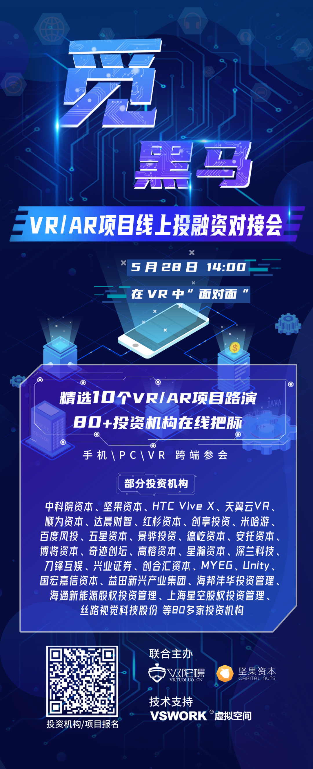 VR陀螺和坚果资本联合发起觅黑马·虚拟空间VR/AR投融资对接会,活动使用VSWORK虚拟空间在VR中进行,80+投资机构,10个精选团队,扫描图片二维码报名: