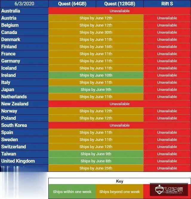 最新数据显示,Quest的库存一直保持相当稳定,两个内存版本的头显在23个地区中的20个都有销售。尽管与不久前的“无法购买”相比有所改善,但至少没有像美国和加拿大那样分别要到6月25日和6月30日才能发货。