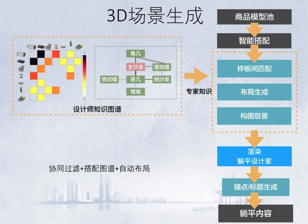 基于日渐成熟的3D技术,借助3D自动理解、自动创作的能力,通过学习现有3D内容的搭配、布局等信息,结合图神经网络(GNN)、视觉技术(CNN)以及自然语言处理相关技术(Transformer)我们让机器拥有了设计师的能力。利用机器生成海量的3D导购内容,并通过个性化推荐技术形成精准的需求匹配,将合适的内容分发给合适的消费者,形成新的用户场景下的产品,引导消费者从单品消费走向场景消费,并真正实现一站式购买。