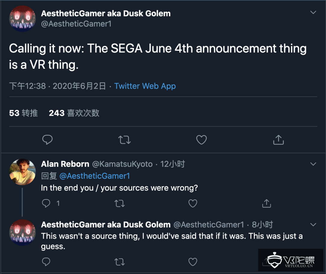 6月2日,游戏爆料人士DuskGolem在推特上发布了一则有关知名游戏厂商世嘉(SEGA)的消息,称SEGA在6月4日将有关于VR的一些事情将公布。但是在回复其他用户中,DuskGolem表示这是他的一个猜测。