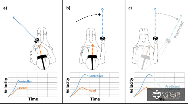 在虚拟现实系统中,减少感知延迟的主要方法之一是预测。在渲染每一帧之前,系统必须决定在虚拟世界中使用什么位置作为透视。因为渲染需要时间,所以理想的位置是渲染完成后用户头部的位置。
