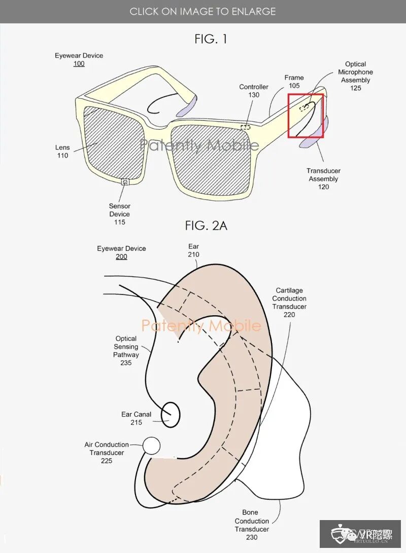 Facebook的专利图1是包括音频系统的眼镜装置的透视图;图2A是包括光纤麦克风作为眼镜设备组件的音频系统一部分的轮廓图。