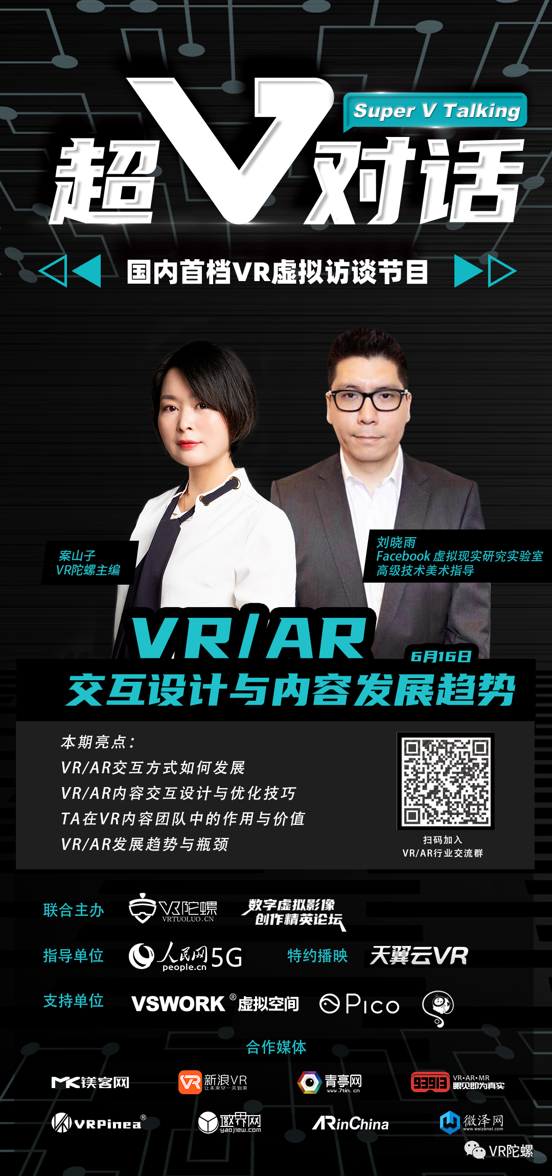 6月16日,由VR陀螺联合中国电信天翼云VR、人民网5G创新中心联合打造首档VR虚拟访谈节目《超V对话》第五期将在天翼云VR App(4K VR版)、人民网5G频道、腾讯视频、Bilibili、优酷、Youtube等各大视频网站同步播出。