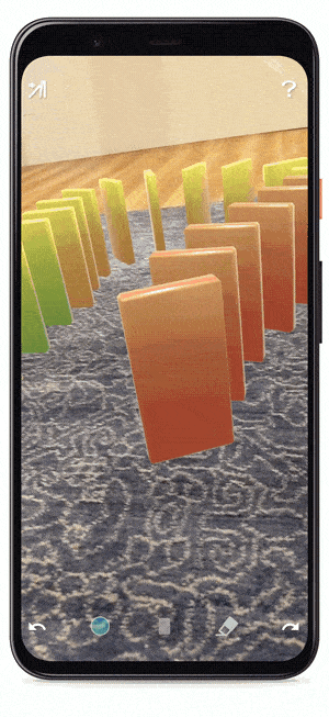 Google Creative Lab(谷歌创新实验室)打造的另一款实验性 Android 应用程序 Lines of Play ,也是将 Depth API 的遮挡功能与碰撞相结合的精彩案例:这款应用将多米诺骨牌的艺术灵感与 AR 融合,借助深度信息,倒塌的多米诺骨牌会与房间中的墙壁、家具产生自然而真实的互动,遮挡与碰撞进一步凸显出技术的魅力。