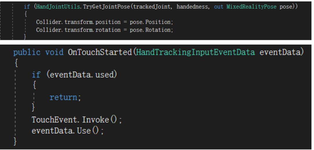 除了以上修改Prefab内容来实现HandTracking的修改,在实际开发过程中运用的更多的还是通过代码去动态的修改手势的状态,具体的代码,在MRTK使用文档中已经有了很多示例,这里在这个方面就不展开了。