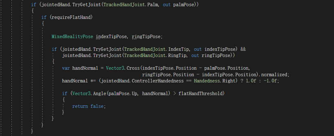 以手掌位置和食指尖形成一个向量,再以无名指和食指形成一个向量,获取这两个向量叉乘的结果,然后判断当前活动手部为左手还是右手,如果是右手那么结果不变,如果为左手,结果乘以-1,以此来得到一个参考向量。随后根据手掌在世界坐标系中Position.y的数值和上面得到的一个参考向量角度差的结果与某个约定的数值作比较,以此来实现自定义手势—手掌翻转这么一个动作。