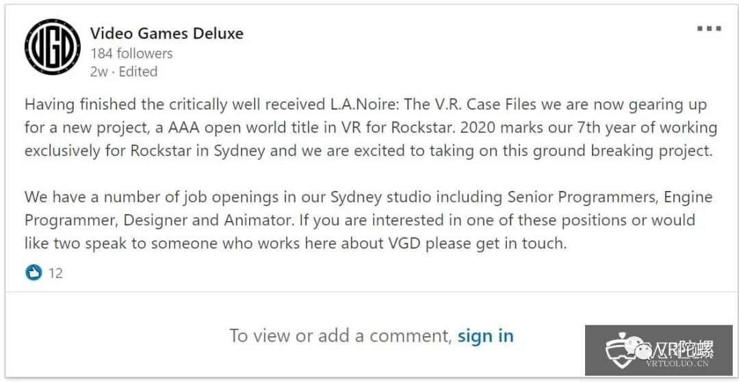 显然,Rockstar对《LA Noire:VR Case Files》(黑色洛城)的游戏效果很满意,继续邀请开发商Video Games Deluxe参与打造新的VR游戏项目。根据领英招聘信息,Video Games Deluxe似乎VR游戏效果进行全新突破。目前该VR游戏项目尚且处于早期开发中,值得期待。