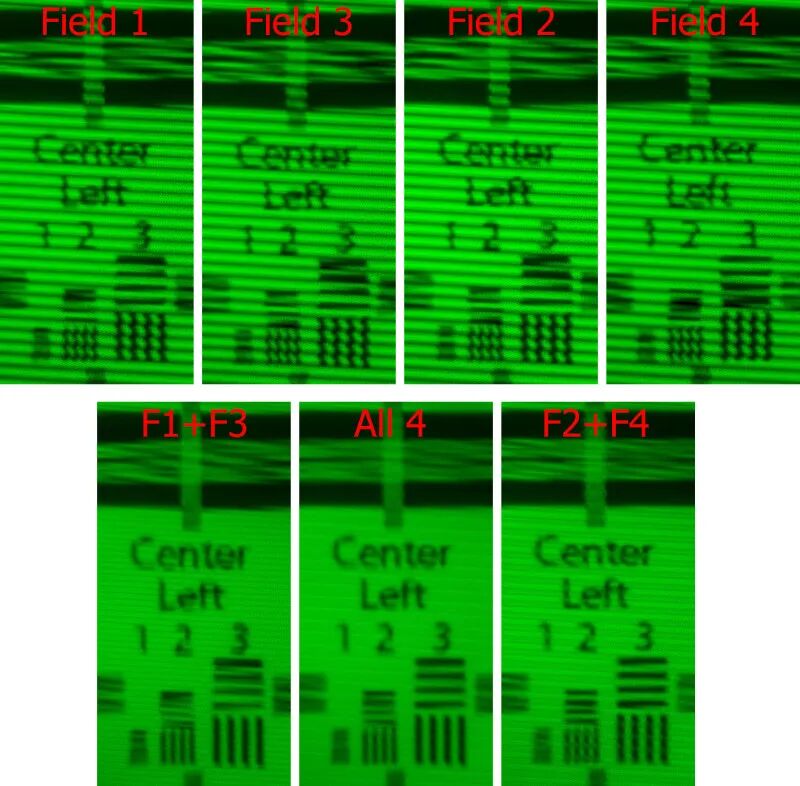 通过上面的两组图的4个场周期叠加后的图对比来看,你会看到这个效果仍然不是很理想,这时你仍能看到一些水平向的明暗纹理等。