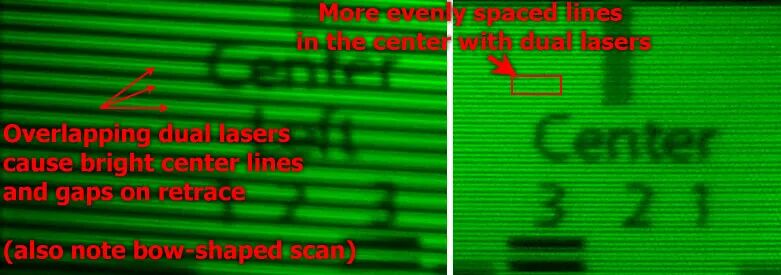 造成这种影响是因为扫描过程中,外部速度较慢,而中心的光则以最大速度移动。因此,如显示相同的像素宽度就需要激光器更快速的切换。