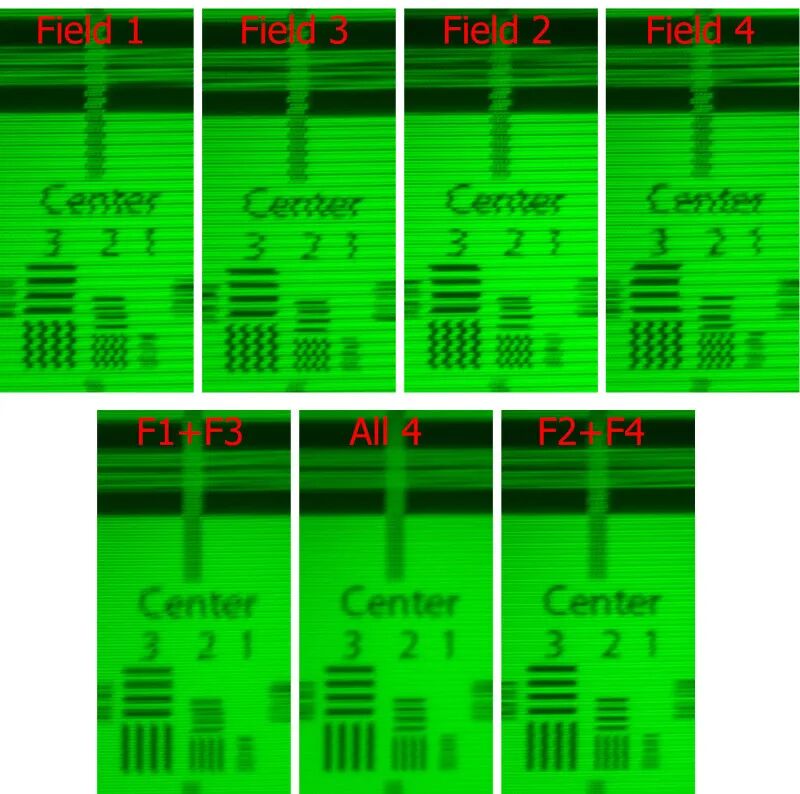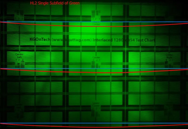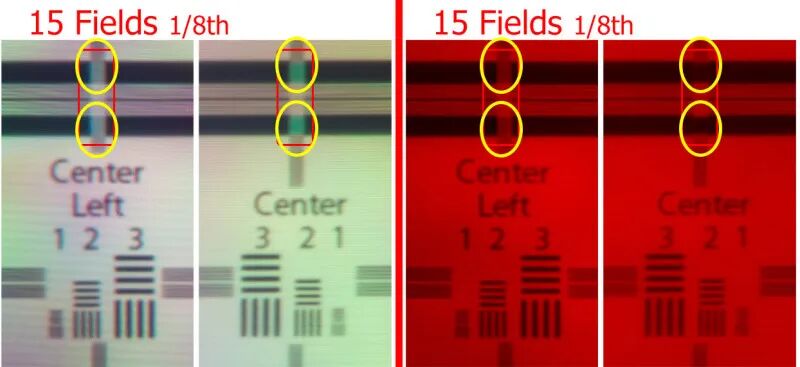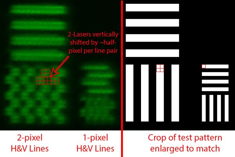 其中,左侧双像素的垂直纹理线每隔两个像素也发生像素偏移,而且像素偏移也是成对出现,上下不对齐的像素约半个像素。同时,每2个像素像素偏移原因是单个场周期中扫描的不同方向,激光在水平扫描的两个方向被分散开。